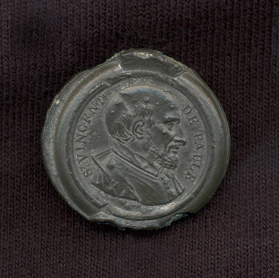 Obverse, lead medal, missing loop and rings; Vincent de Paul bust, cassock, no skullcap; spelled "de Paule," as in early 19th century