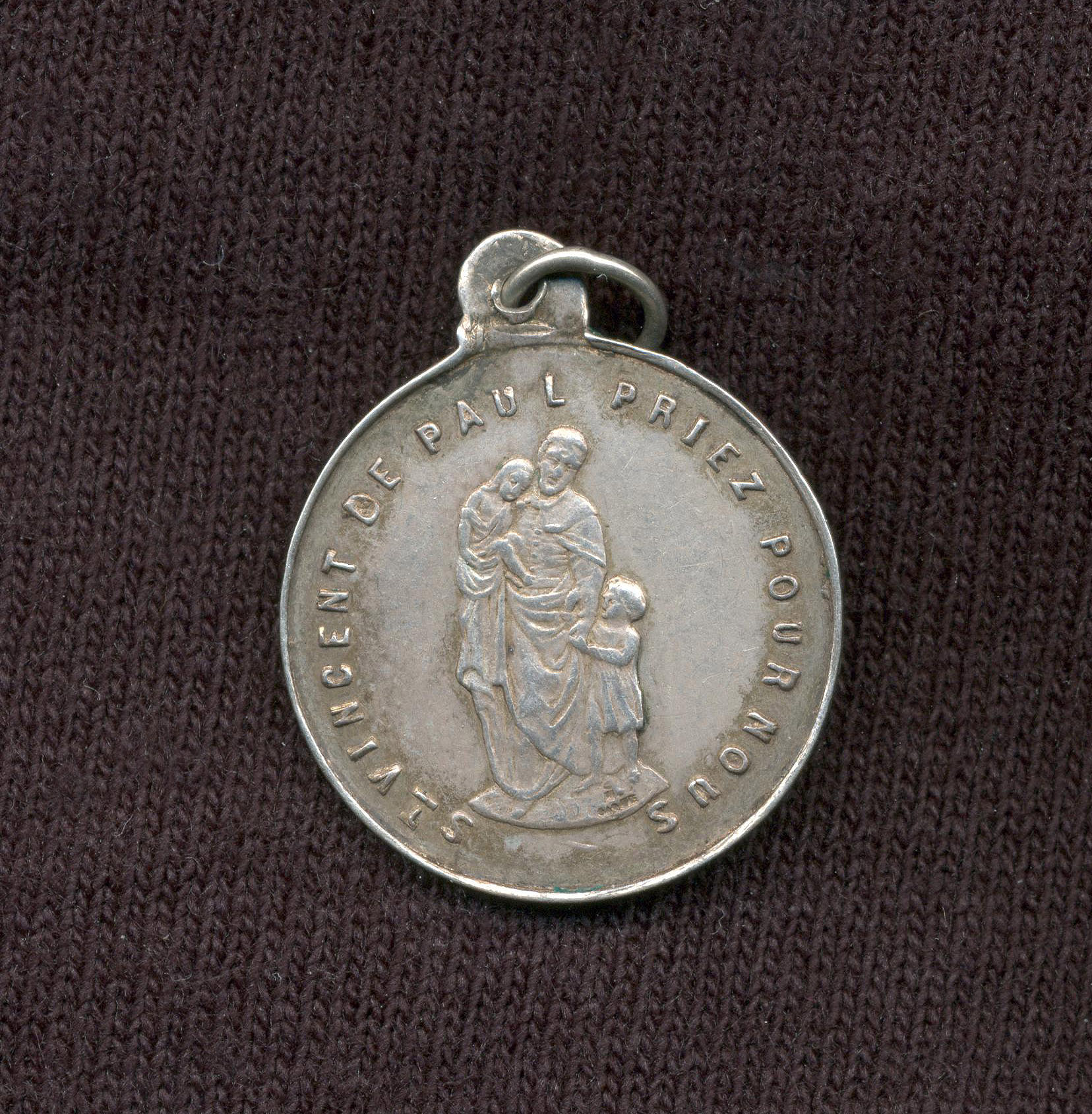 Obverse, nickel, round medal, loop and ring; Vincent de Paul, standing, cassock, mantle, skullcap, with two children; text in French: Pray for us.