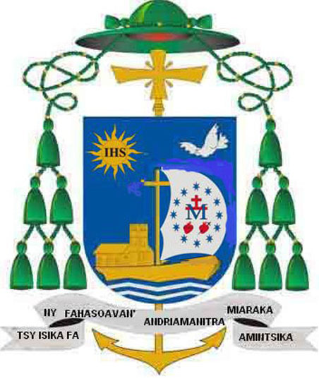 Motto in Malagasy: It is not us by the grace of God with us (based on 1 Cor 15:10). Emblem from Miraculous Medal, reverse, on sail.