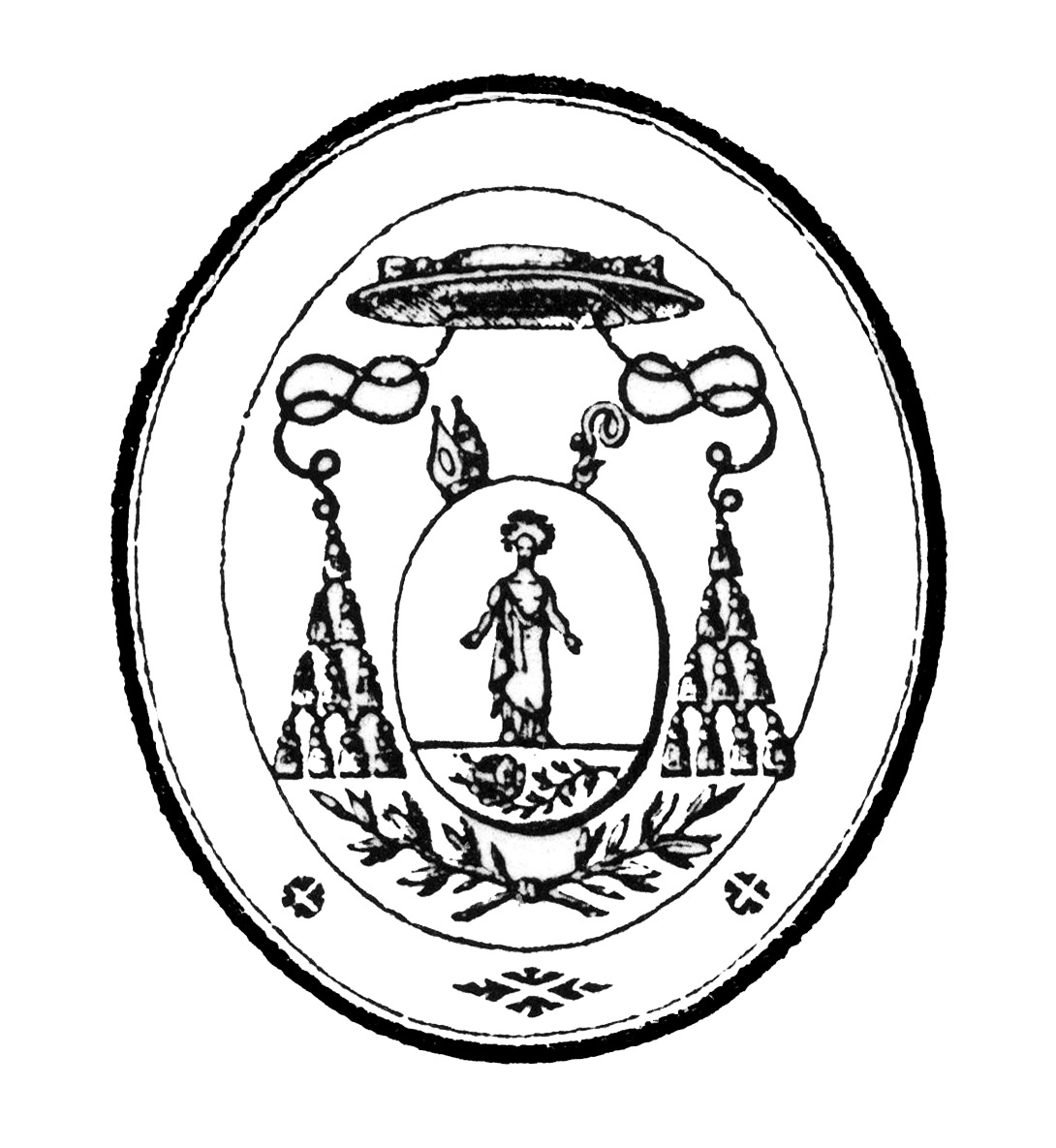 Uses the CM emblem; with a rose below, alluding to his name. Four rows of tassels on the shield did not identify him as an archbishop. Taken from his official stationery.
