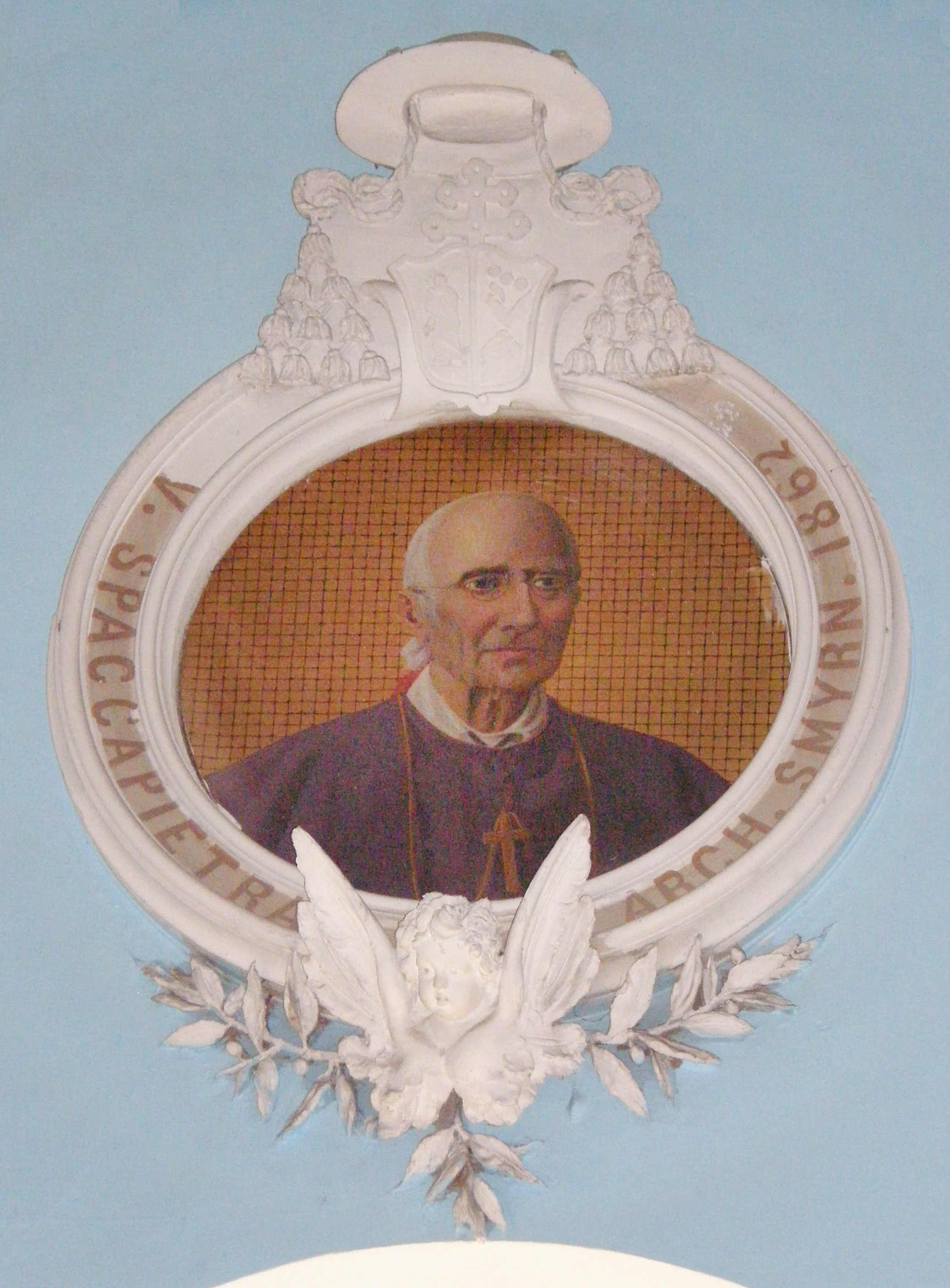 Nuncio to Haiti; bishop of Port of Spain, Trinidad; vicar apostolic of Palestine; archbishop of Smyrna/Izmir; mosaic in his cathedral in Izmir