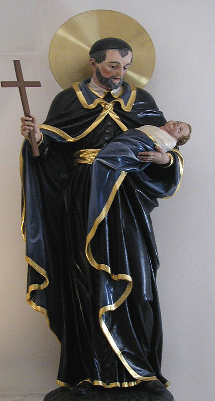 Plaster statue, Vincent de Paul in gold trimmed garments, holding cross, child; large metal halo. Original in chapel, Daughters of Charity provincial house, Ljubljana