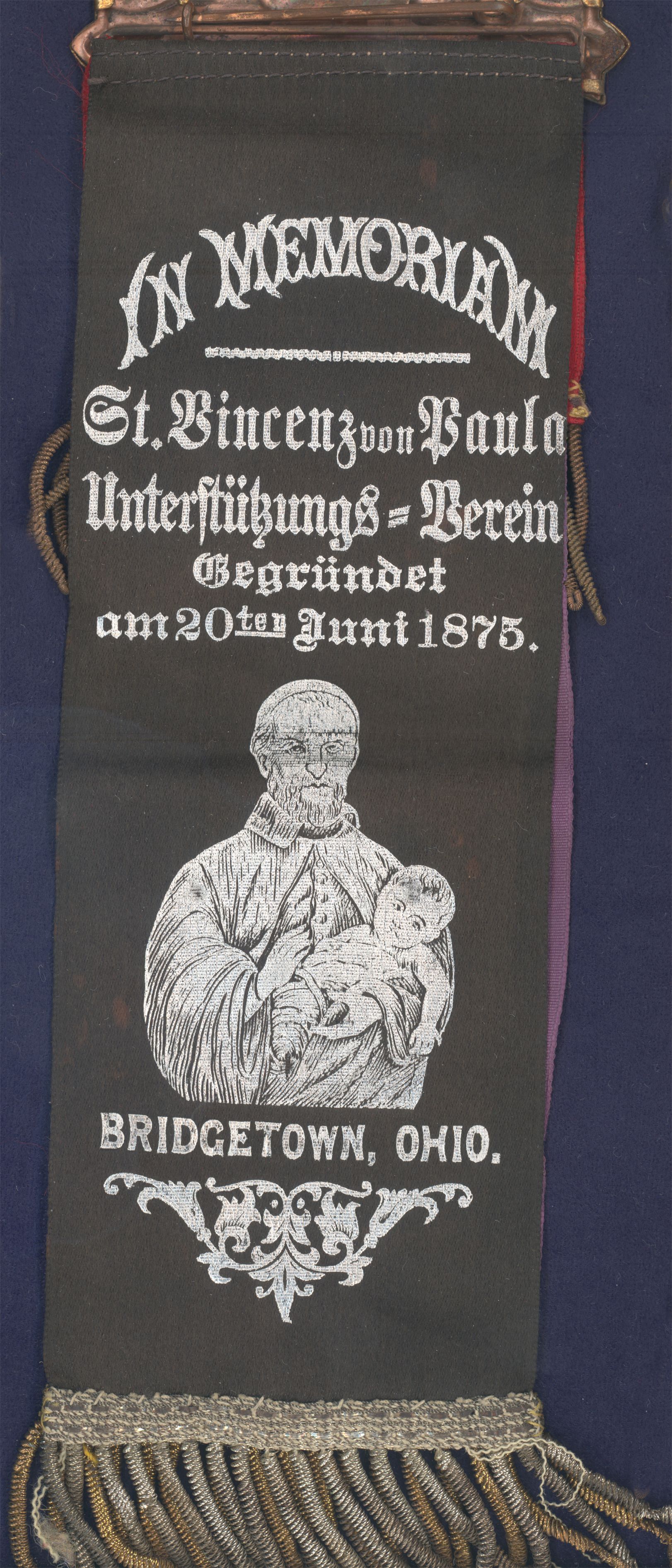 Memorial ribbon, St. Vincent de Paul Society, Bridgetown, Ohio, founded 1875; silver metallic print on black silk ribbon, fringe; DePaul University collection
