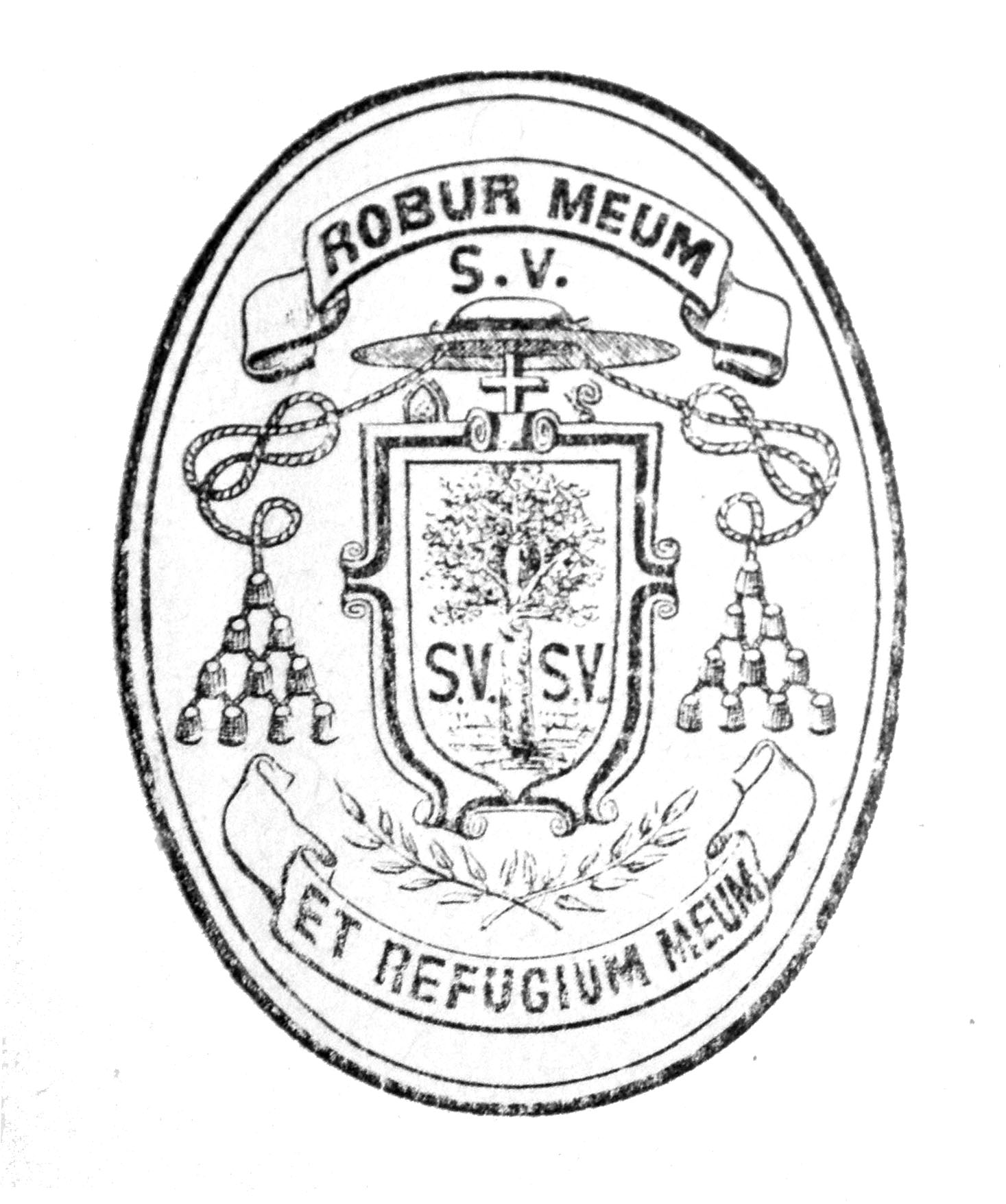 Motto (above and below together): My strength and my refuge. Oak tree in shield, with SV twice and also above hat.