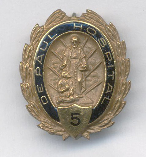 Vincent de Paul, holding hat, with poor man at his feet; rays recall galley oars; perhaps from DePaul Hospital, St. Louis, Missouri