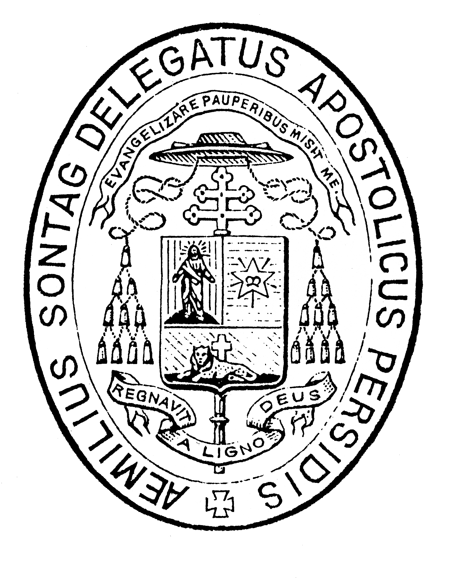 Motto, upper: He has sent me to preach the Gospel to the poor; lower: God has reigned from a tree. CM emblem on shield. Star with stylized letter M (Mary); and silver cross behind golden lion of Persia. Martyr