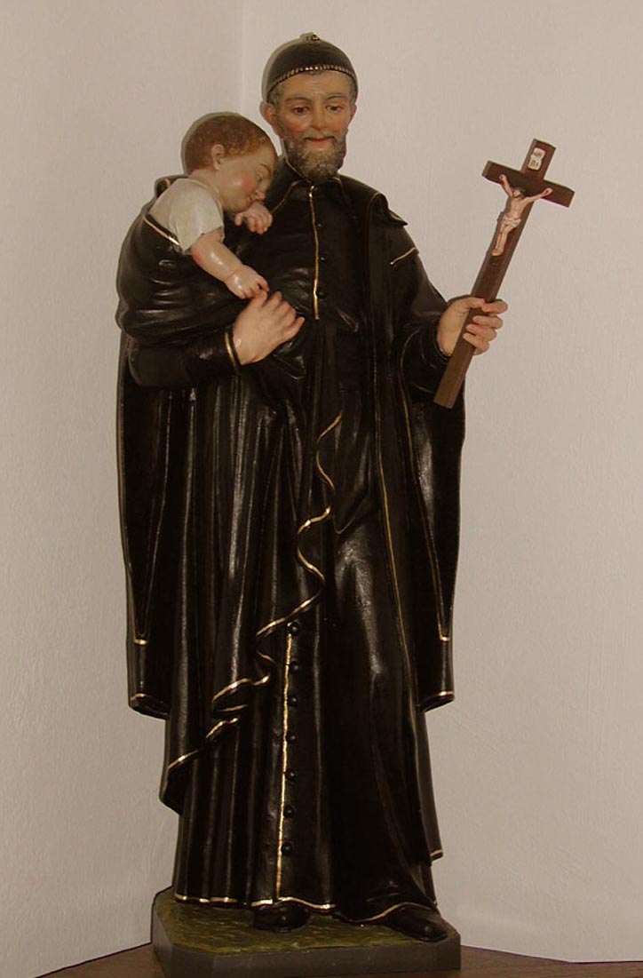 Plaster statue, Vincent de Paul in cassock, mantle trimmed in gold; holding crucifix, child in his arms. Original in Vincentian house, Miren