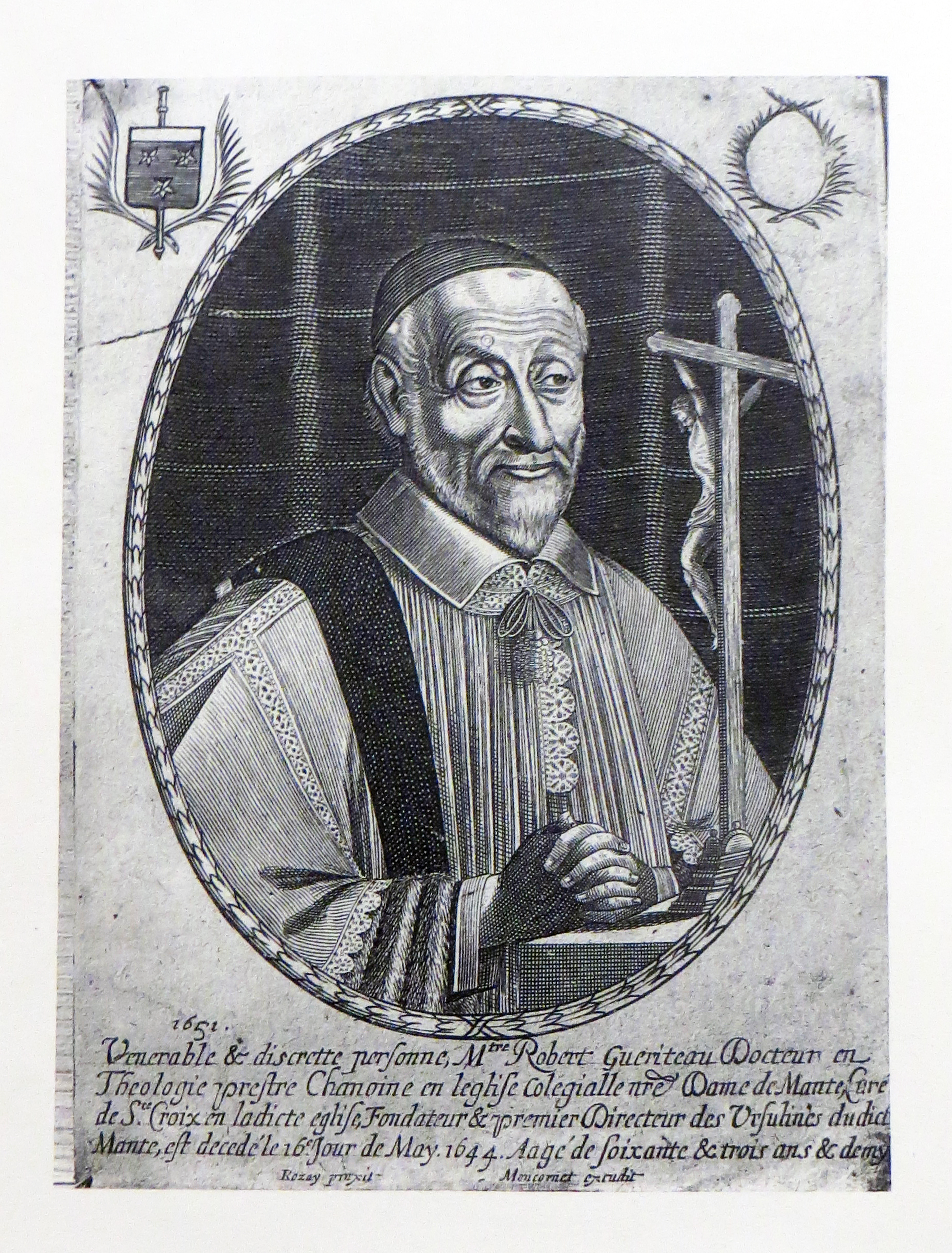 Doctor in theology; priest, canon of the collegial church of Notre Dame de Mante, pastor of Holy Cross in the said church; founder and first director of the Ursulines of Mante; age 63 1/2