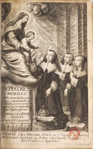 Anne of Austria, Duchess of Savoy, Queen of England; frontispiece of a book by Sebastien de Senlis, Capuchin; on the reformation of orders of nuns.