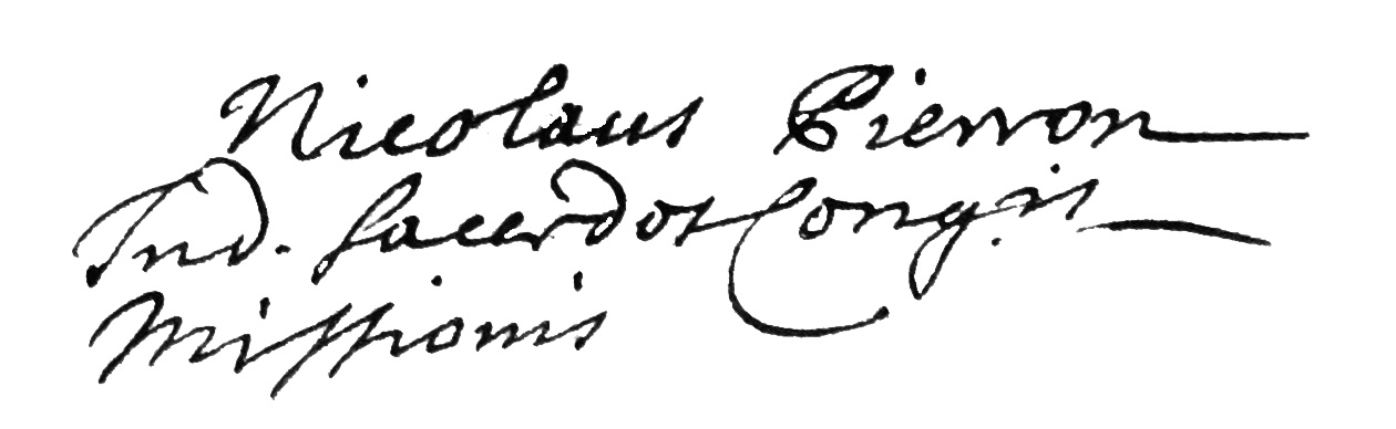 Latin text: Nicolas Pierron, unworthy priest of the Congregation of the Mission