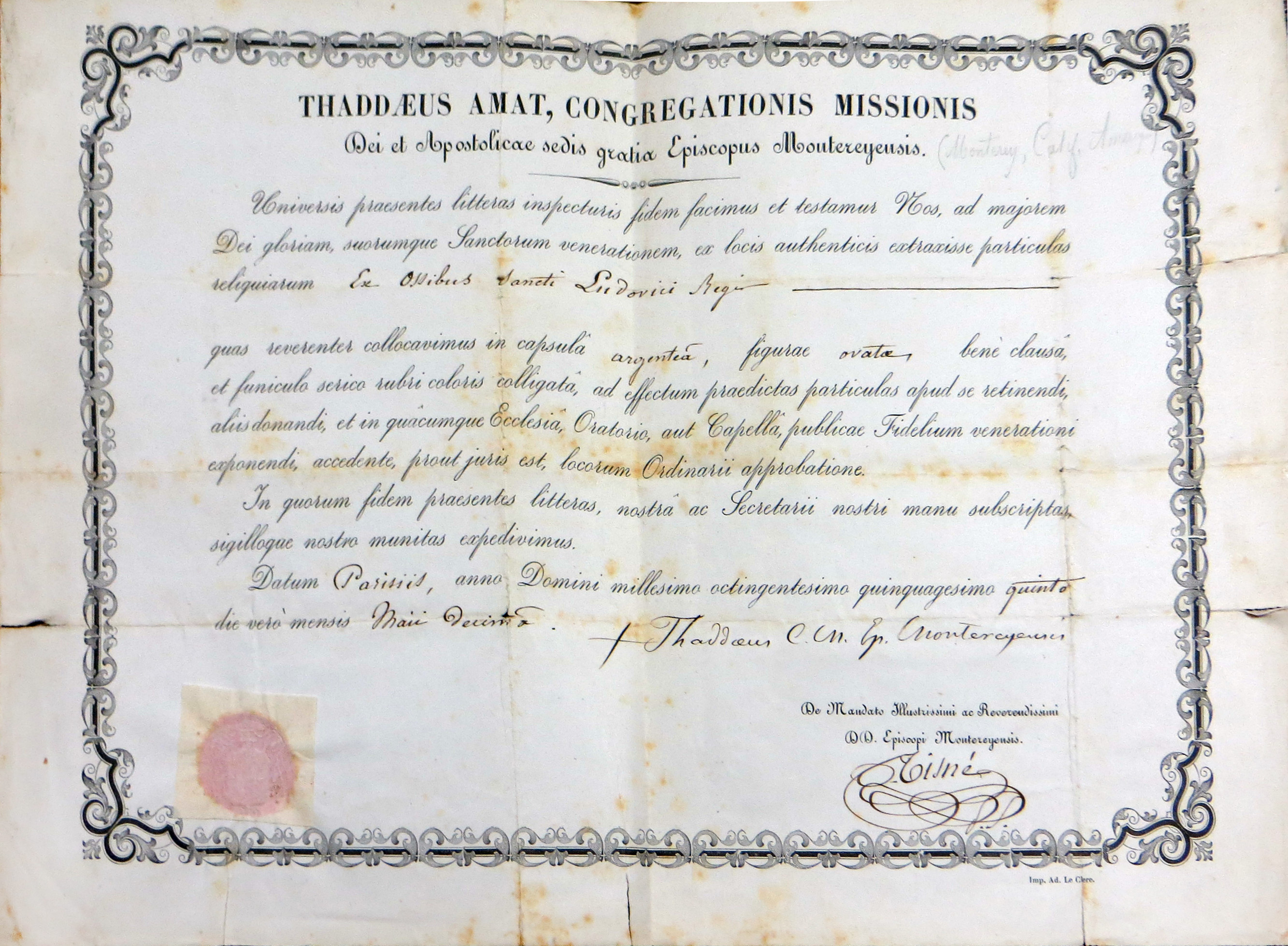 Attestation for relic of St. Louis, King of France, signed in Paris, 10 May 1855 Locates Amat with date and place