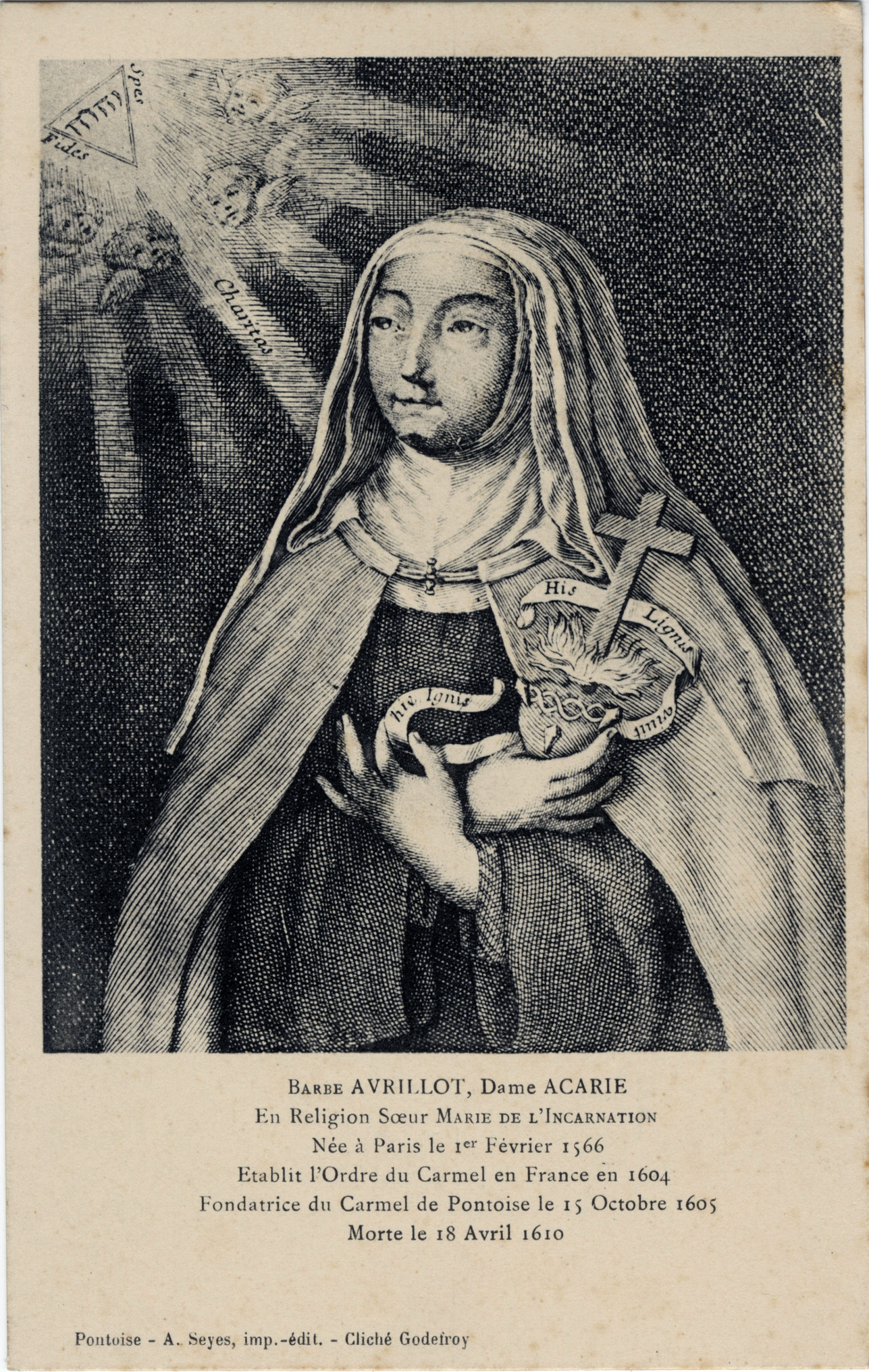 Text: In religion, Sr. Marie of the Incarnation; born Paris, 1 February 1566, established the Carmelite order in France in 1604; foundress of the Carmel of Pontoise, 15 October 1605; died 18 April 1610; holding a burning heart, with crown of thorns, cross; Latin text: She lived with this fire, this wood