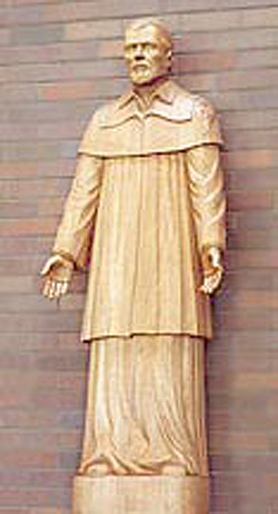 Gilded statue, Vincent de Paul, standing, cassock, surplice, shoulder cape, hands down in gesture of welcome; location of original unknown, perhaps Alabama; internet image (?); modeled on Rue de Sevres statue