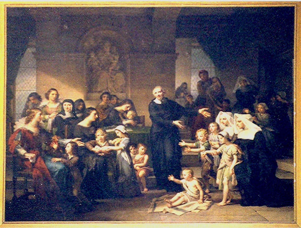 Vincent de Paul preaches to Ladies of Charity about foundlings; Louise de Marillac and Daughters of Charity present. Original in cathedral, St Jean, Lyons; artist: Charles Meynier (d. 1832)