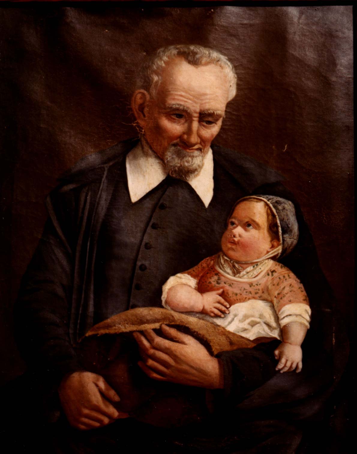 Oil on canvas, Vincent de Paul, standing, cassock, mantle, no skullcap, holding child in his left arm; location of original in St. Georges-de-Lisle