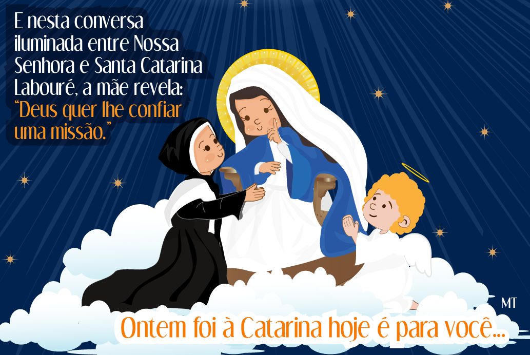 Text: In this illuminated conversation between Our Lady at St. Catherine Labouré, the mother revealed: God wishes to confide a mission to you