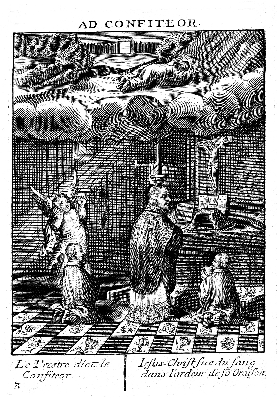 altar with frontal, floor tiles with flowers, painting behind altar, perhaps the baptism of Jesus