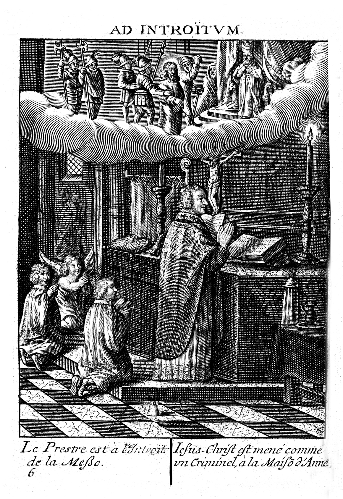 Generic floor tiles, altar painting, perhaps presentation of Jesus in temple; chasuble with flower decoration