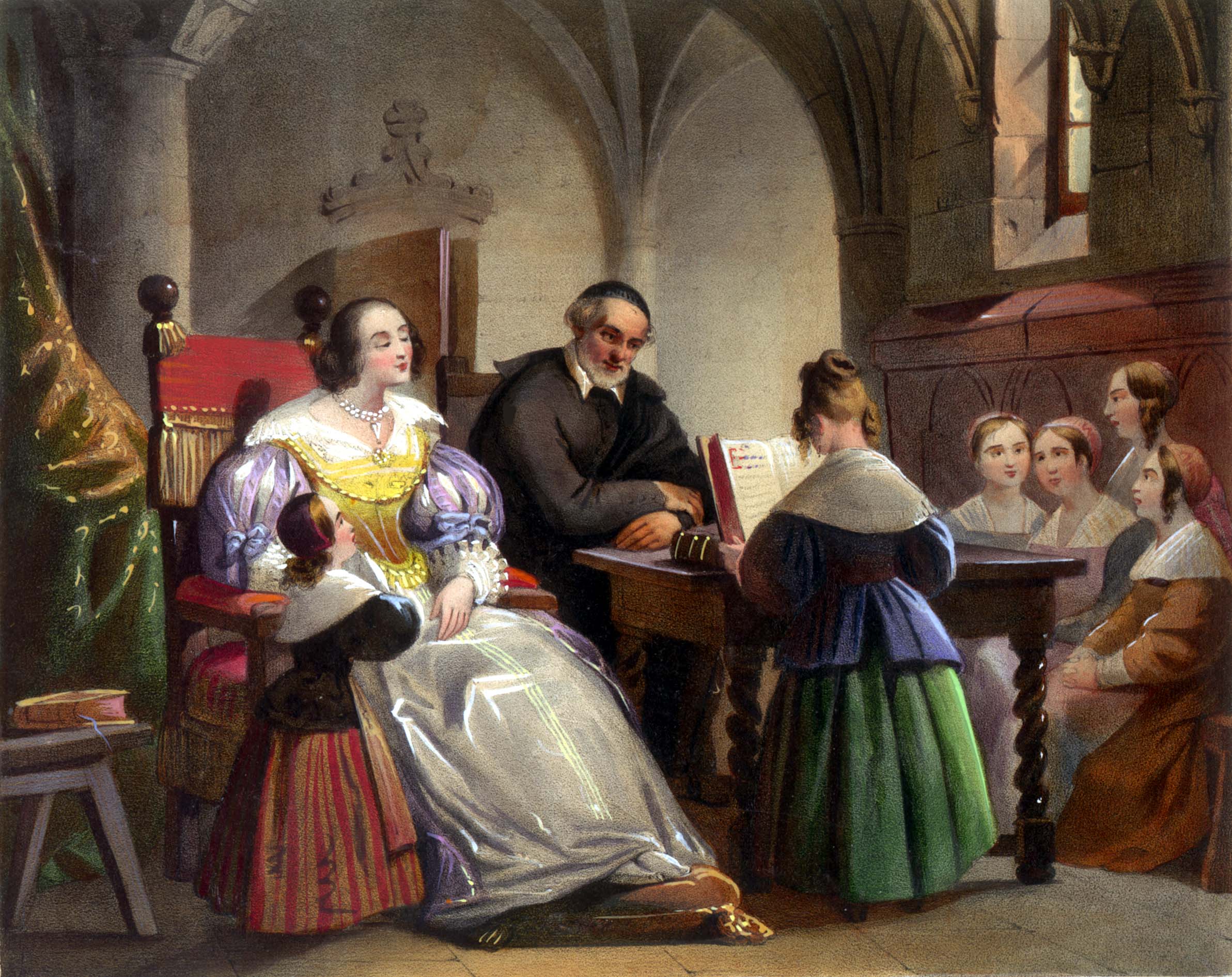 Painting/illustration?; Vincent de Paul seated, cassock, cape, skullcap; listening to girl reading, in presence of Mlle de la Fayette; location of original unknown