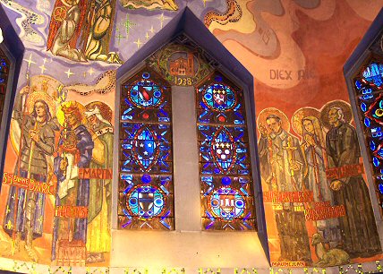 Mural; Vincent de Paul among gallery of French saints, cassock, surplice, stole, skullcap, halo, holding crucifix; original in parish of Juvisy