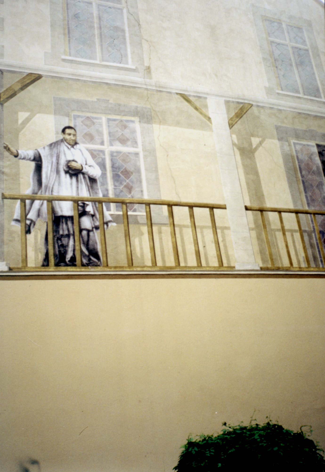 Mural, Vincent de Paul, standing, cassock, surplice, skullcap, holding biretta; gesturing from painted porch; original in square in front of parish of Clichy