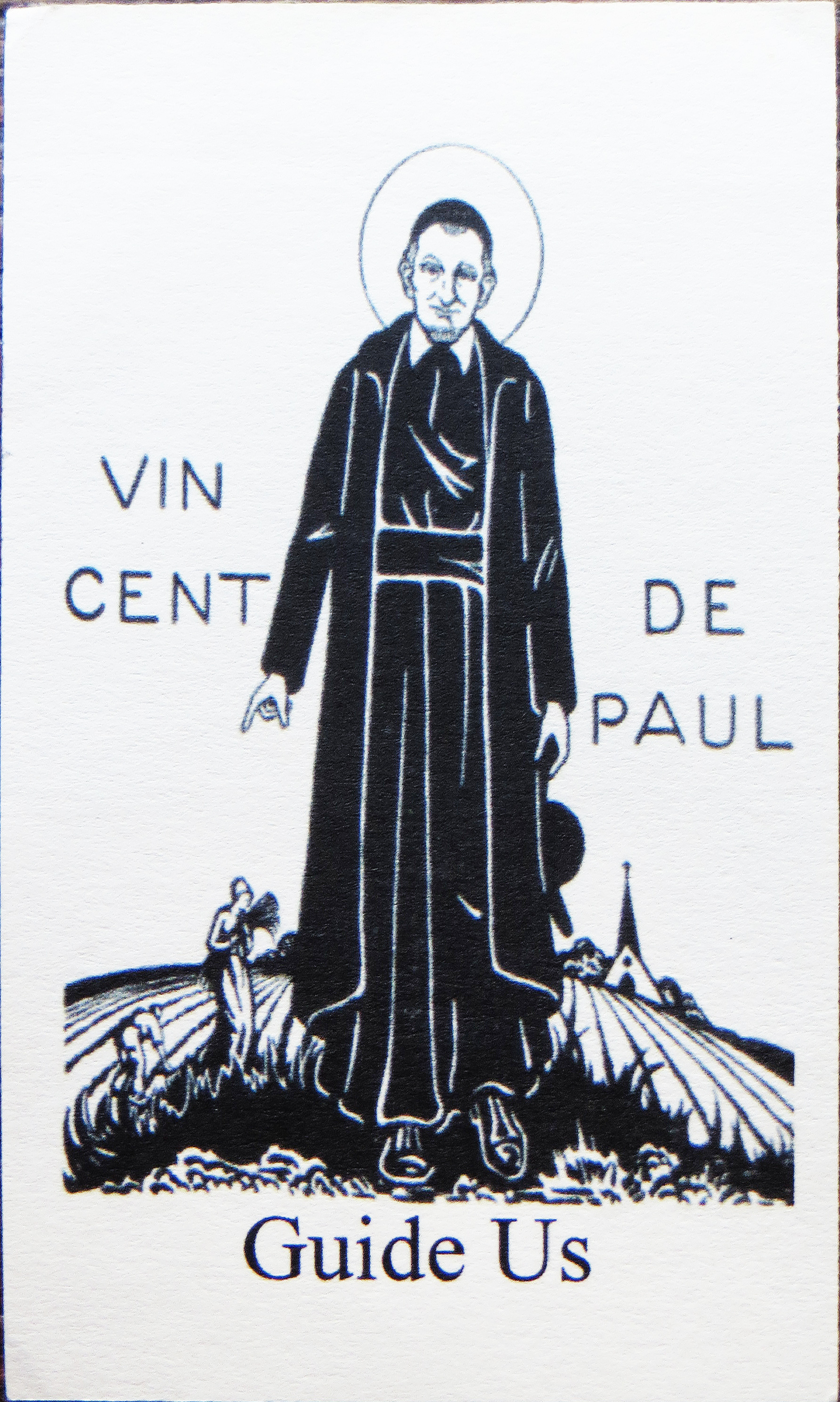SVdP, standing, in cassock, cincture, mantle, holding hat