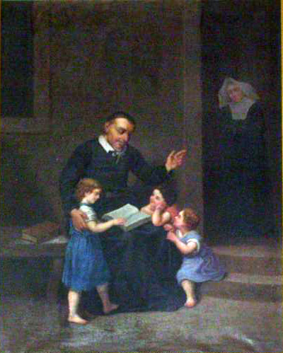 Oil on canvas, 19th century; Vincent de Paul, seated, cassock, skullcap, book in his lap, teaching (orphan) girls, Daughter of Charity in background; original in Saulieu; work of Mathieu Geslin