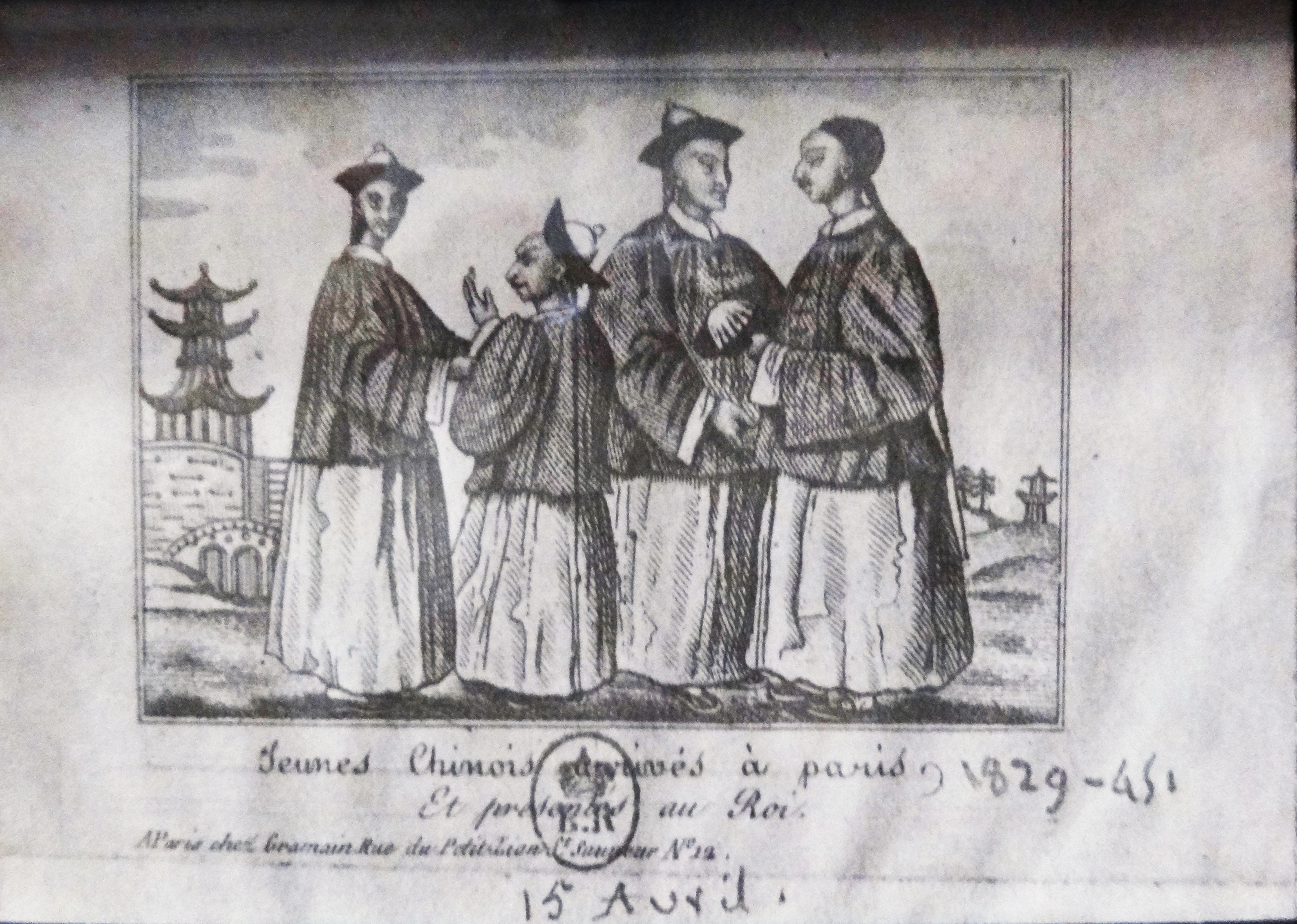 Text: Young Chinese students arrived in Paris and presented to the king [Charles X], original engraving