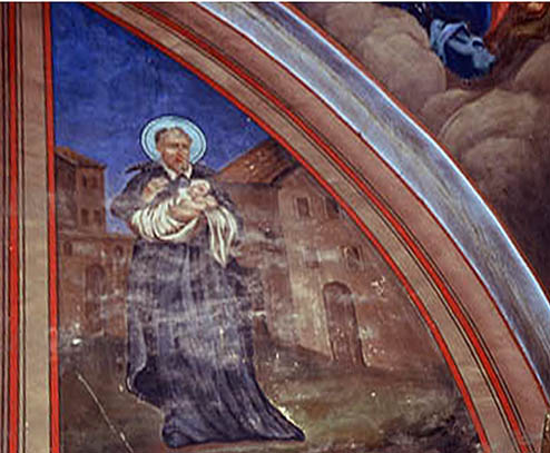 Mural painting, Vincent de Paul, standing, cassock, mantle, skullcap, light blue halo; holding child; outdoor scene