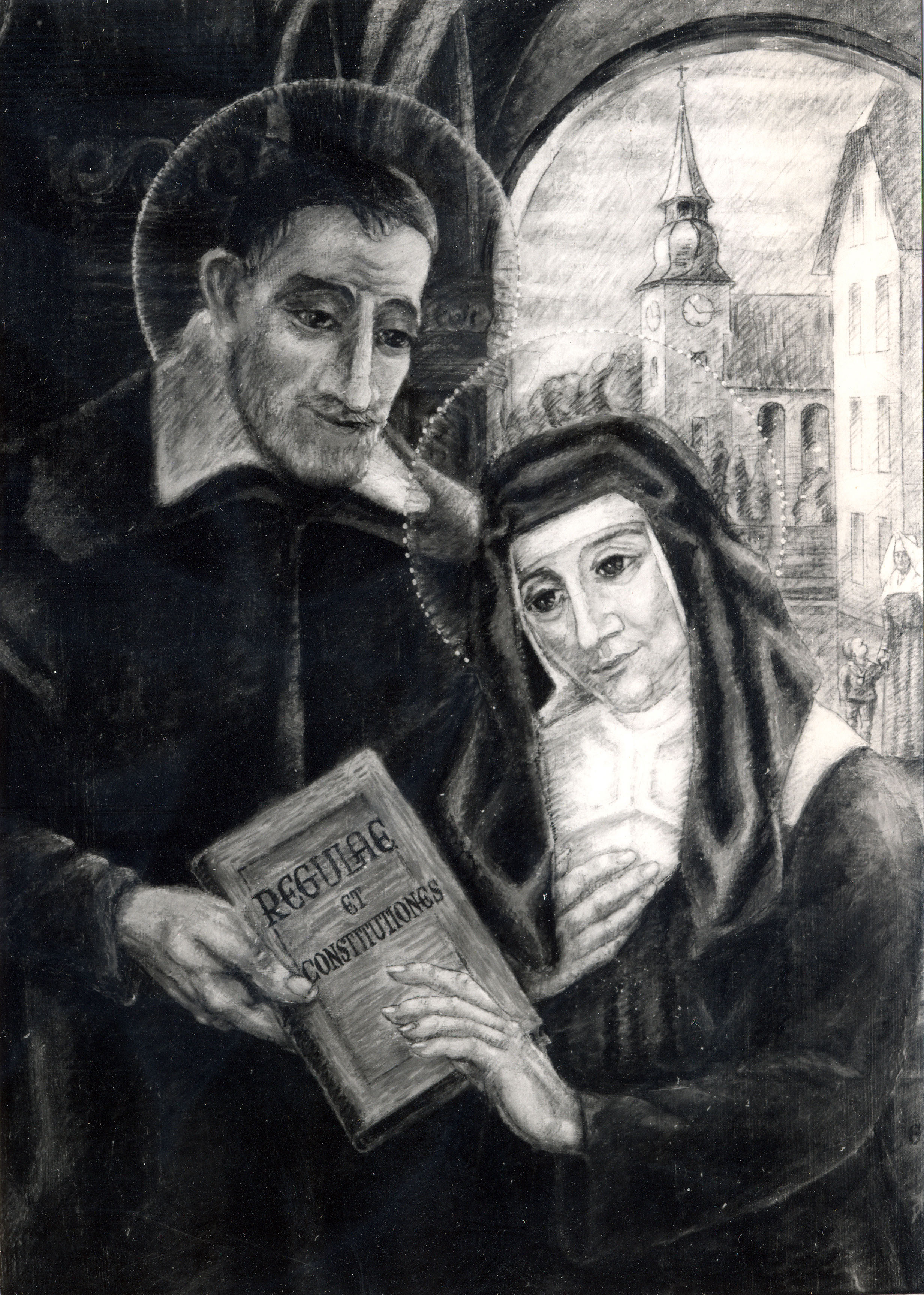 Black and white photo of painting; Vincent de Paul, standing, cassock, mantle, skullcap, halo; rule book, title in Latin; Louise de Marillac, with halo (after beatification); location of original unknown; in Gunth collection, Paris