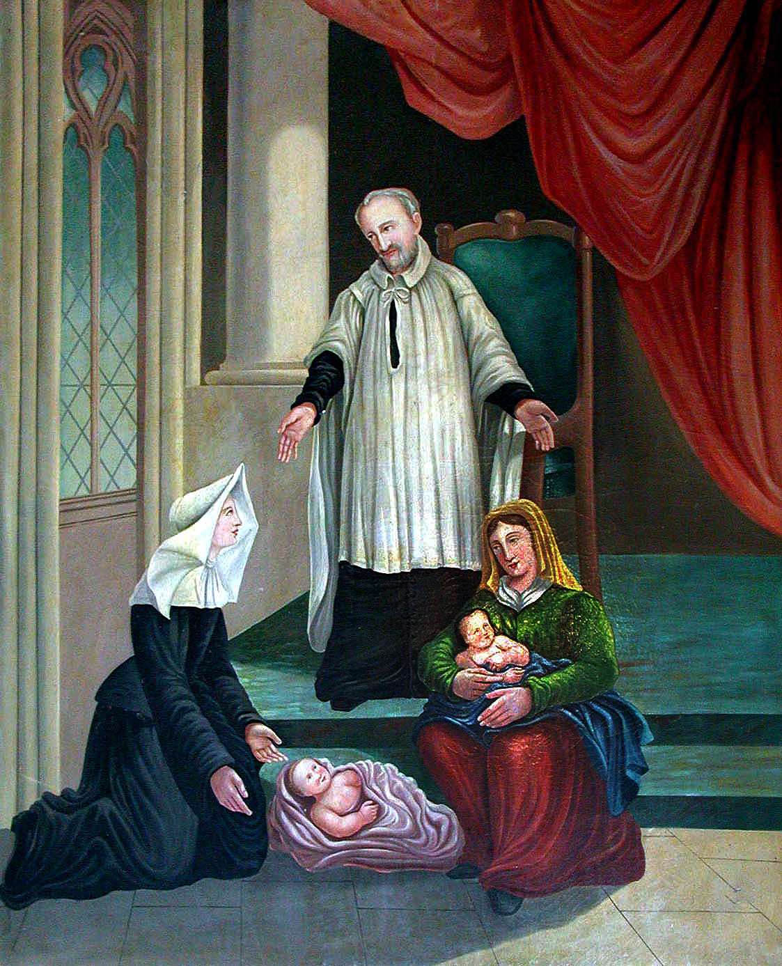 Vincent de Paul, standing, cassock, surplice; Daughter of Charity kneeling, mother holding infant; infant on floor in blanket; original in Pauillac; courtesy of C. Lautissier