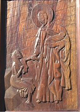 Vincent de Paul standing, with two poor children; internet image; location of original unknown