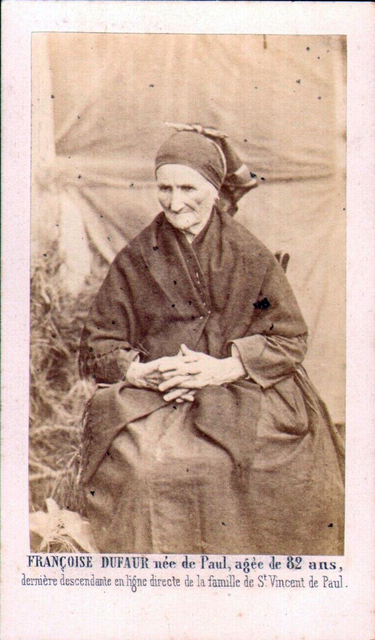 Text: Françoise Dufaur, born: de Paul, age 82; last descendant in direct line of the family of SVdP