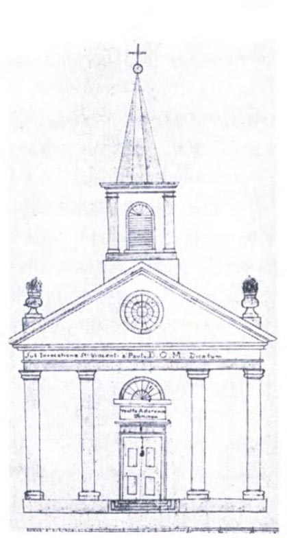 Architect's drawing of façade, in letter of John Timon to JB Etienne, 26 May 1838; very similar to Old Cathedral, St. Louis