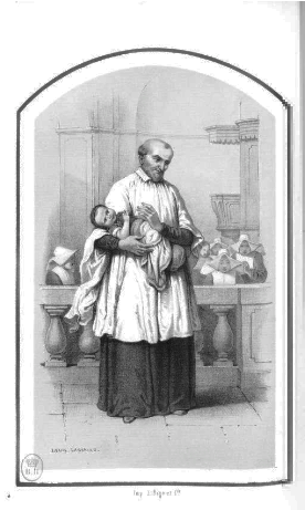 SVdP holding infant, in chapel with Daughters of Charity