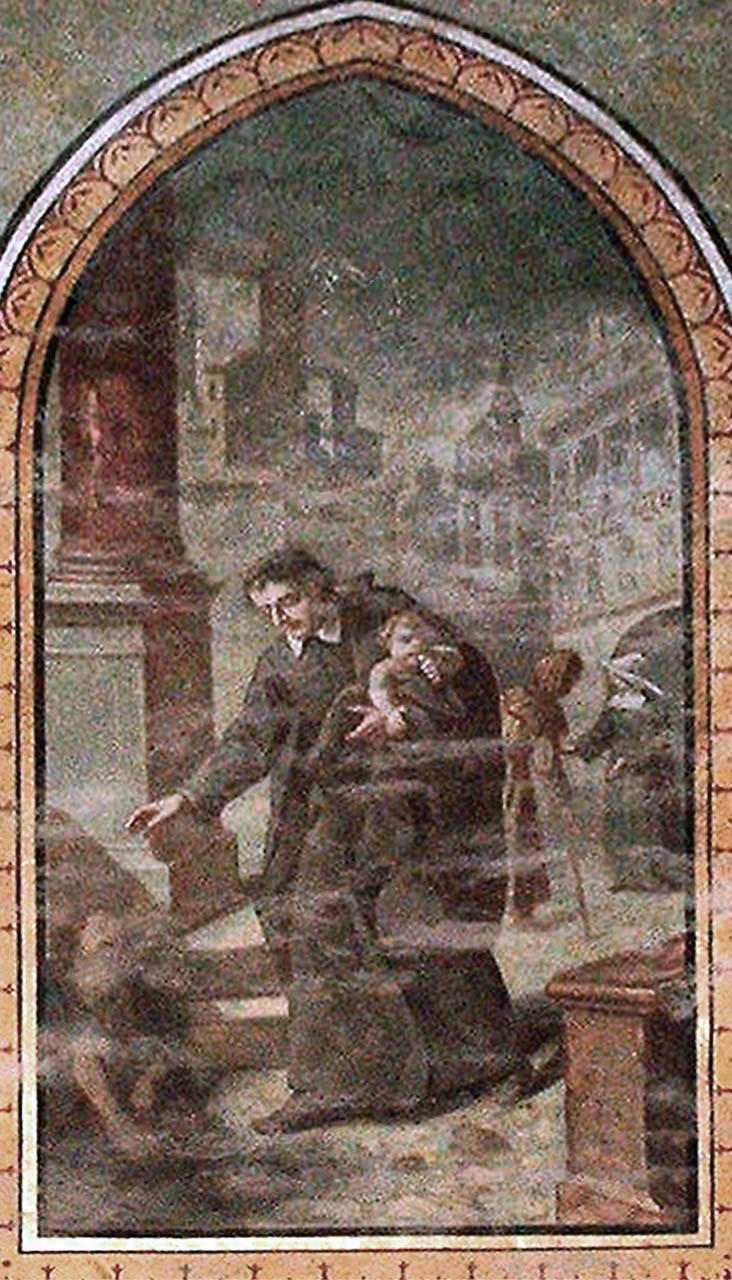 Mural painting; Vincent de Paul, standing, cassock, mantle, skullcap, holding child in his arms, prepares to gather another foundling; handicapped person in background with Daughter of Charity; original in parish, Buzet-sur-Tarn