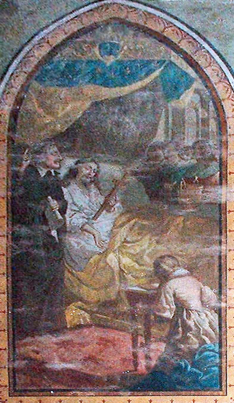 Mural painting; Vincent de Paul, standing, cassock, mantle, skullcap, at deathbed of Louis XIII, holding crucifix; queen kneeling in foreground; courtiers in background; original in parish, Buzet-sur-Tarn