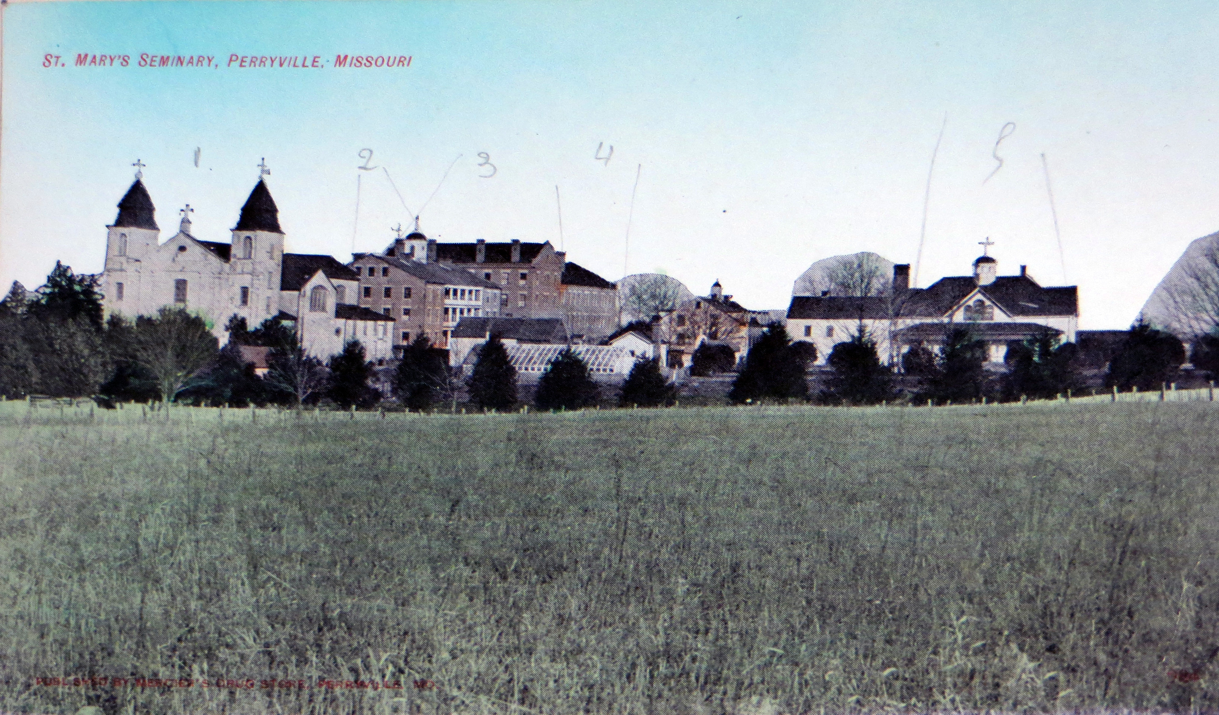 Colored post card, with numbers written above buildings