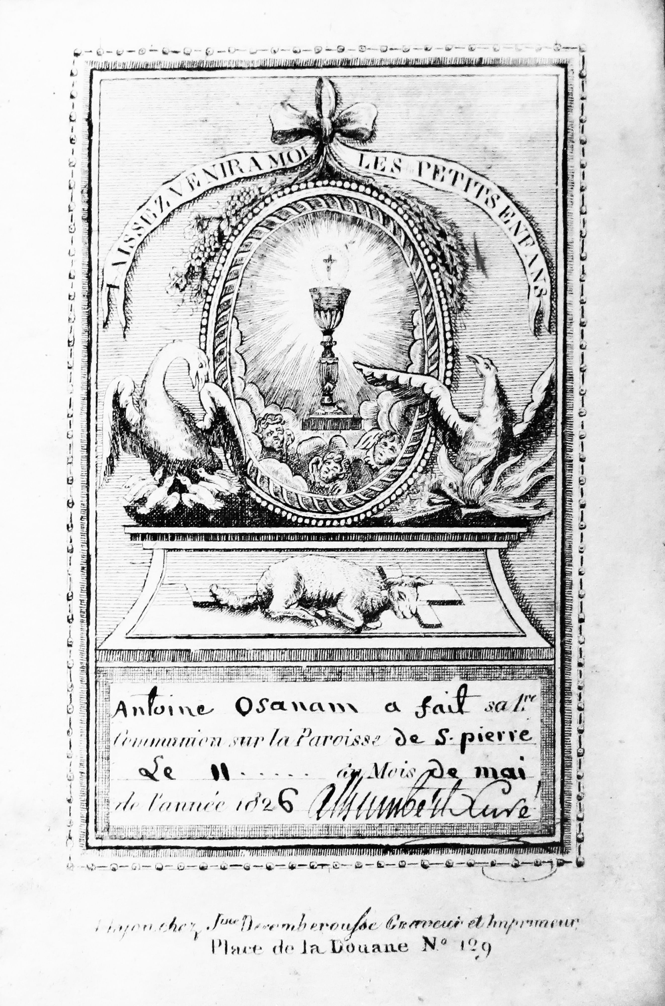 Text: Antoine Osanam [sic] made his first communion at the parish of St. Pierre [Lyons] 11 May 1826. Signed by pastor