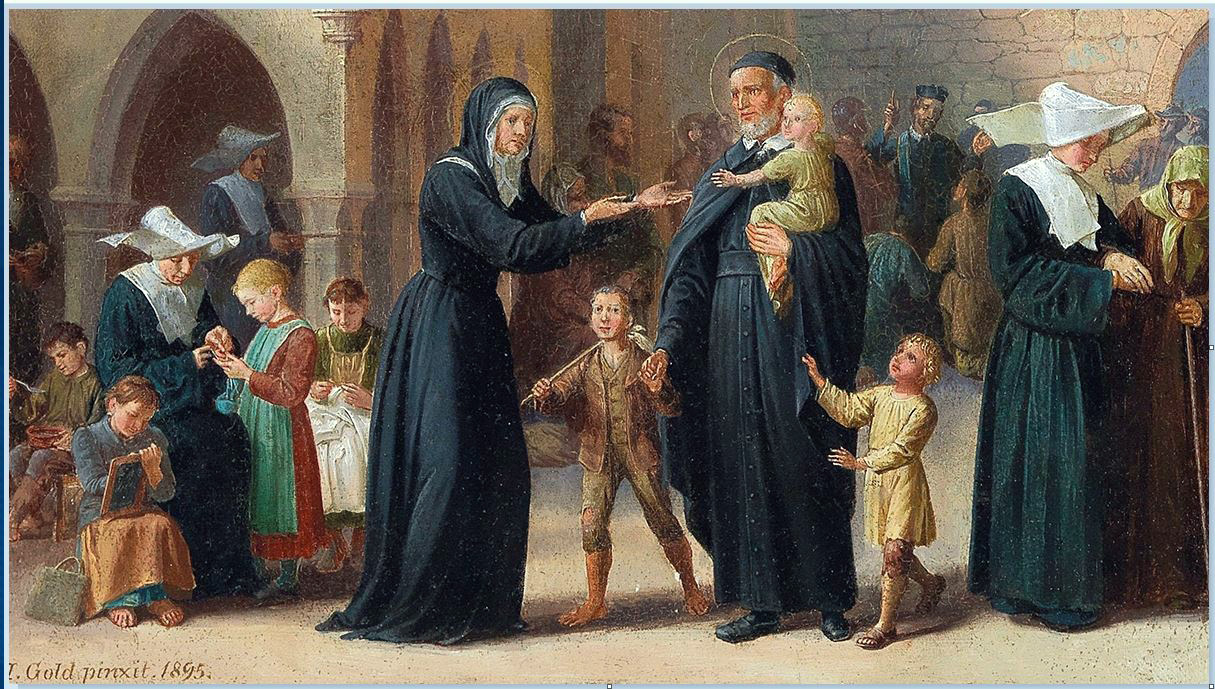 DC teaching, helping elderly; LdM shown with halo before her beatification in 1920; one CM in background