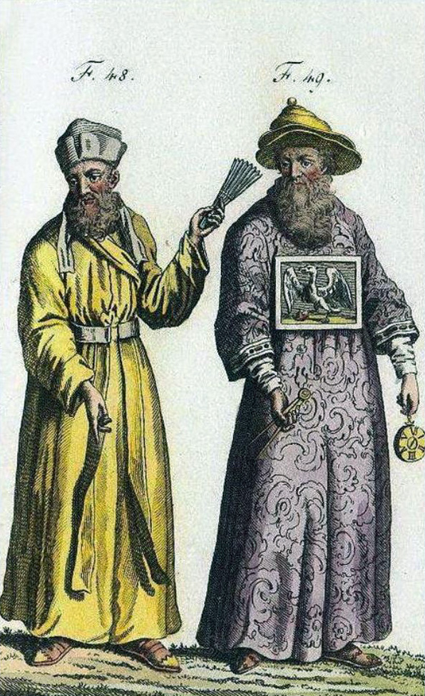 Left: priest; right: rank of mandarin, holding astronomical instrument; long beards