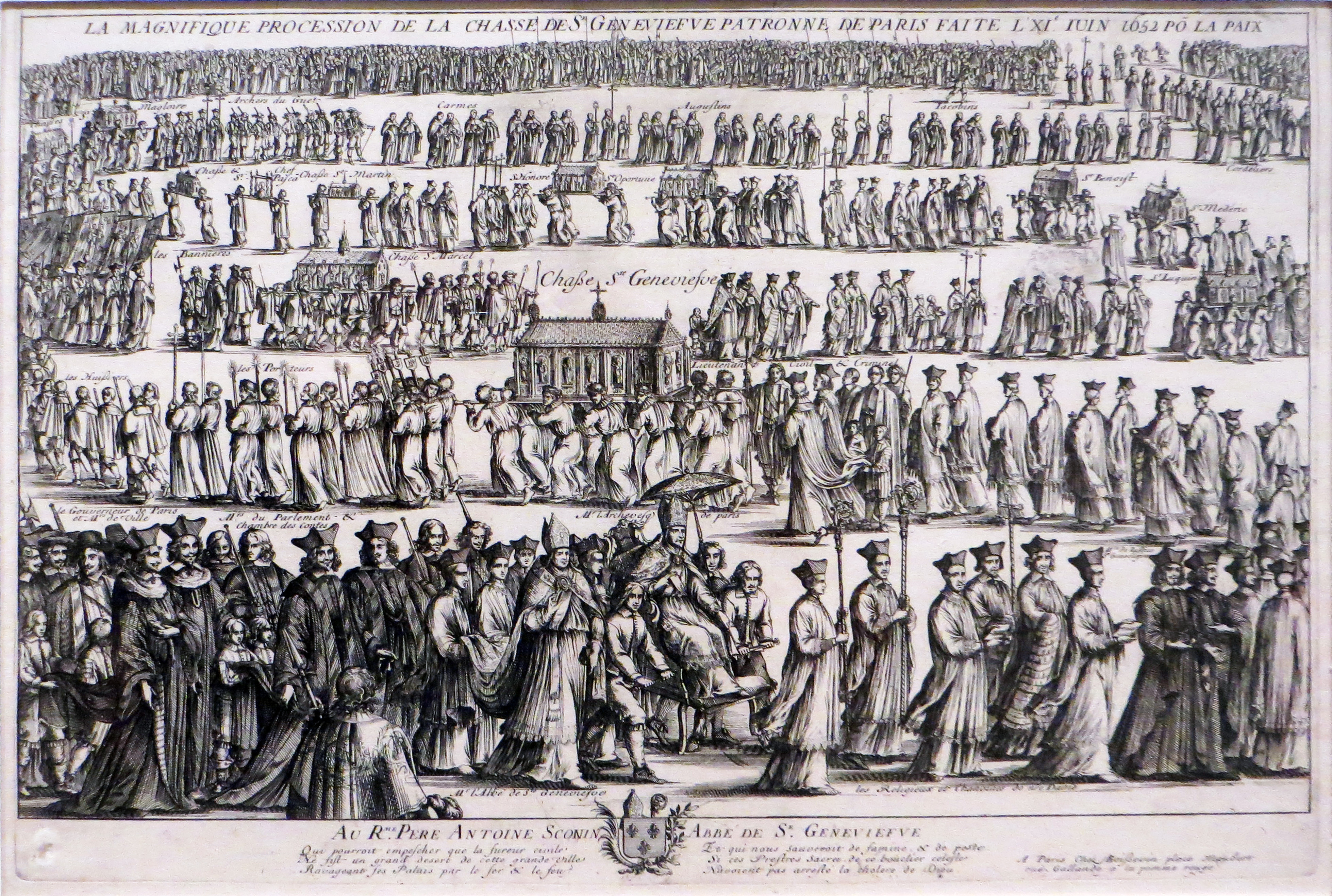 Identifies various groups; Bishop Jean-François de Gondi, carried in a chair; religious; ,