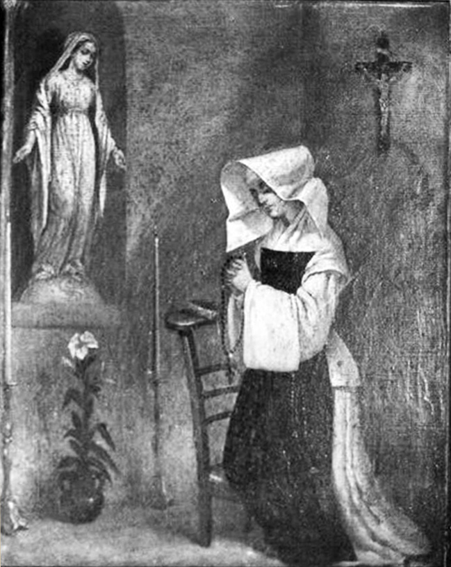 Sister praying the Rosary, kneeling, statue of BVM