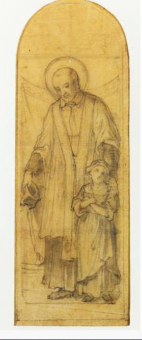VdP, holding biretta, and a child; artist: Jean Gaspard Jules Gsell, 19th c.