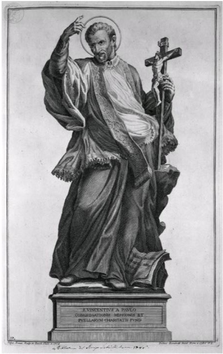 Engraving by Camillo Tinti of Bracci statue in Vatican; Vincent de Paul evangelizing, with crucifix