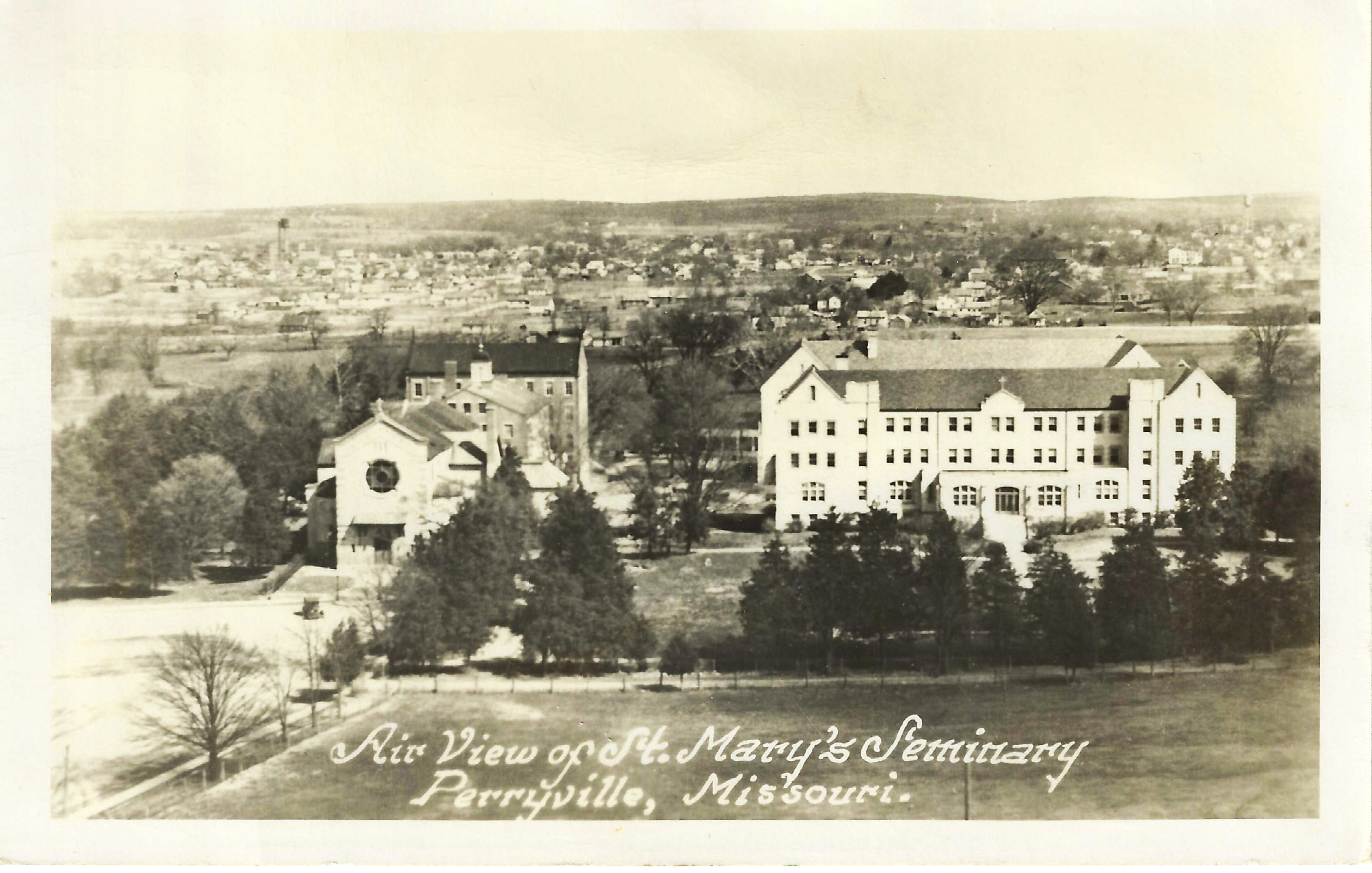 View taken from water tower, facing east; novitiate opened 1929; student bldg. opened 1931