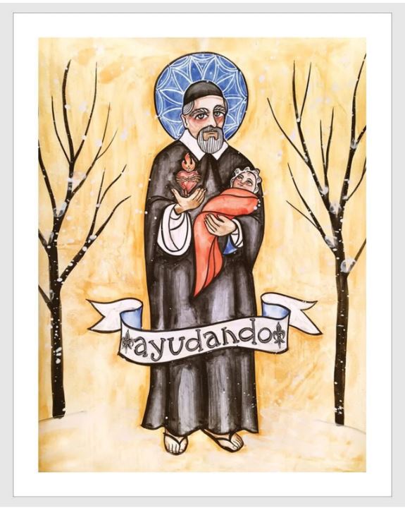 Text in Spanish: "Helping." -- Burning heart of Charity; holding infant