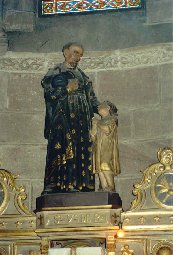 Painted and gilded statue; Vincent de Paul, standing, cassock, mantle, holding tricorne hat; girl at the side; original in Auvergne, exact location unknown