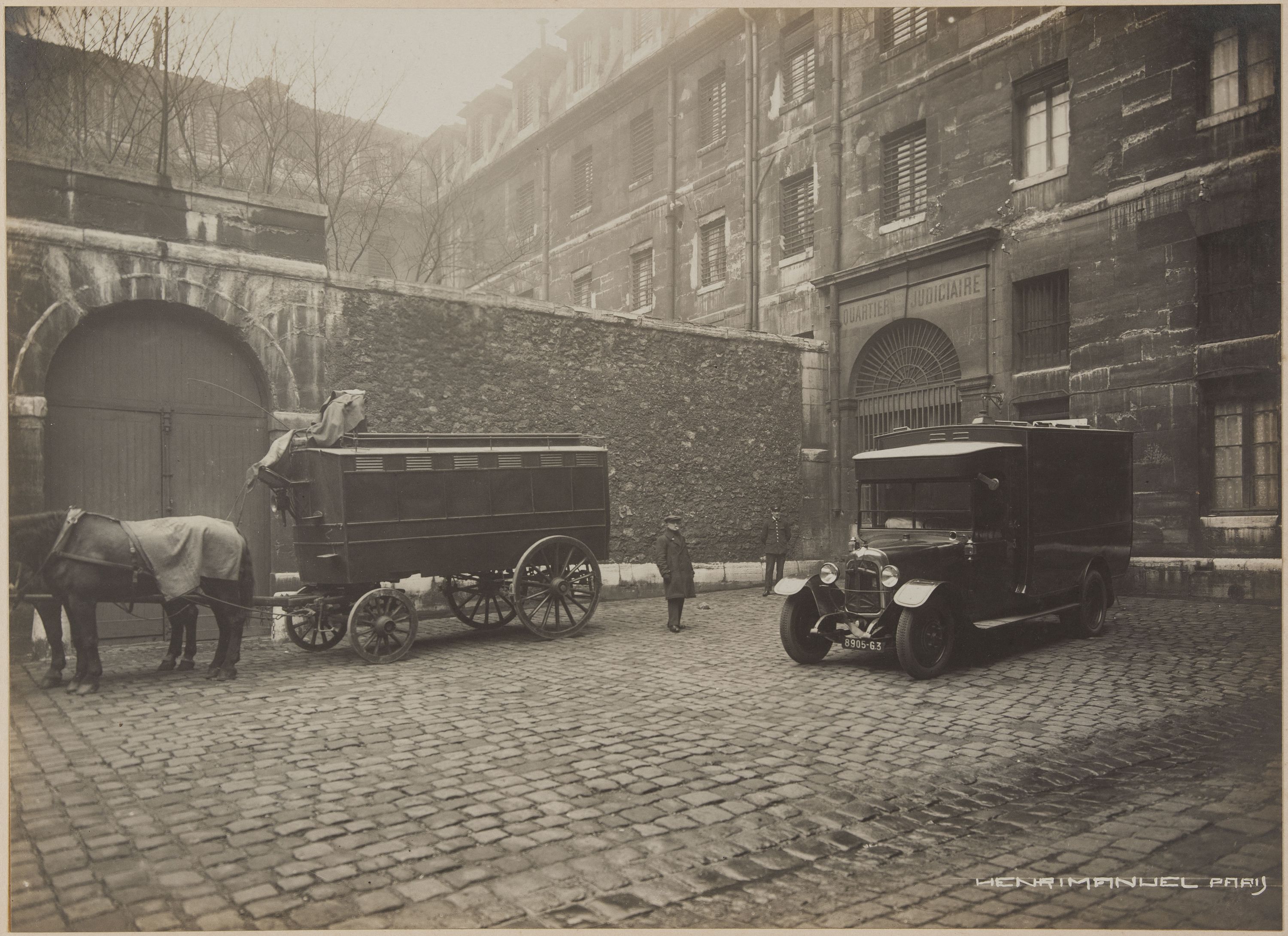 Prison wagon at entry courtyard, with bus, employees