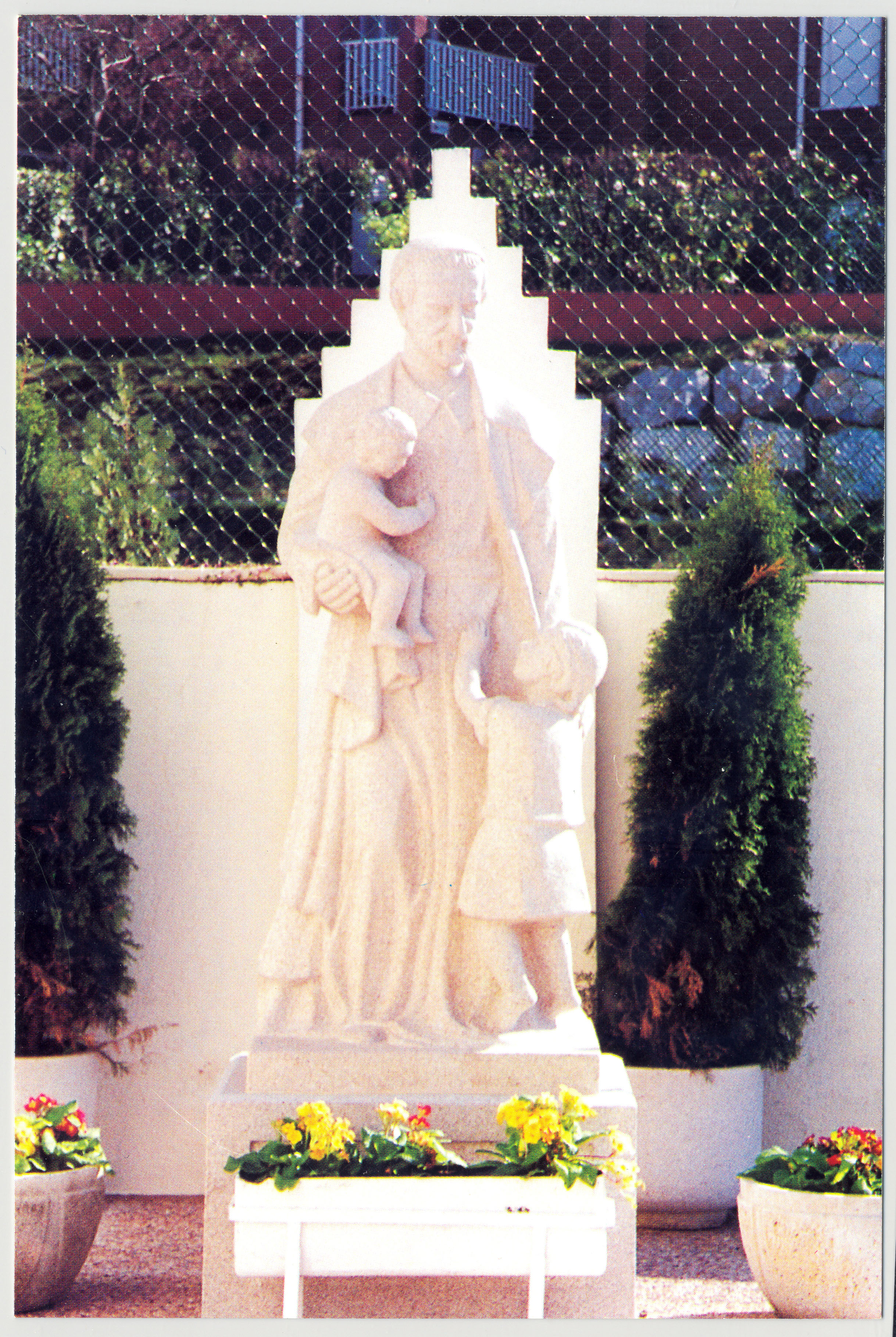 Stone statue, Vincent de Paul, standing, cassock, cincture, mantle, skullcap, two children; in garden; location of original unknown; Gunth collection, Paris